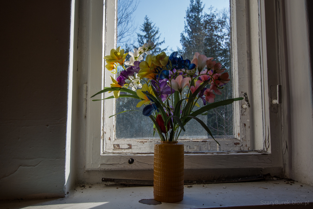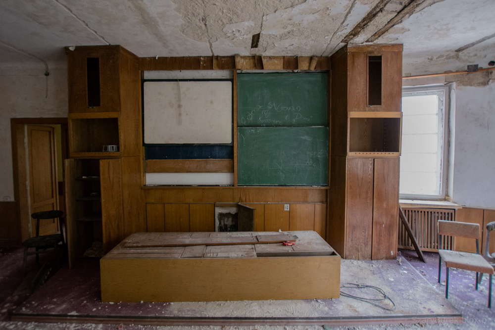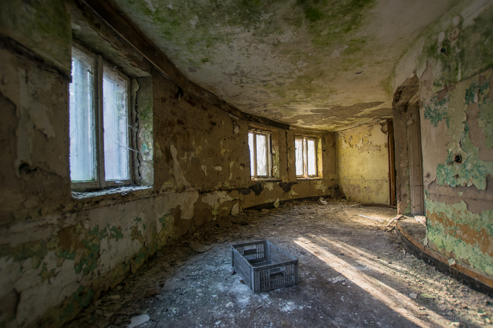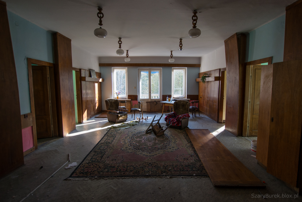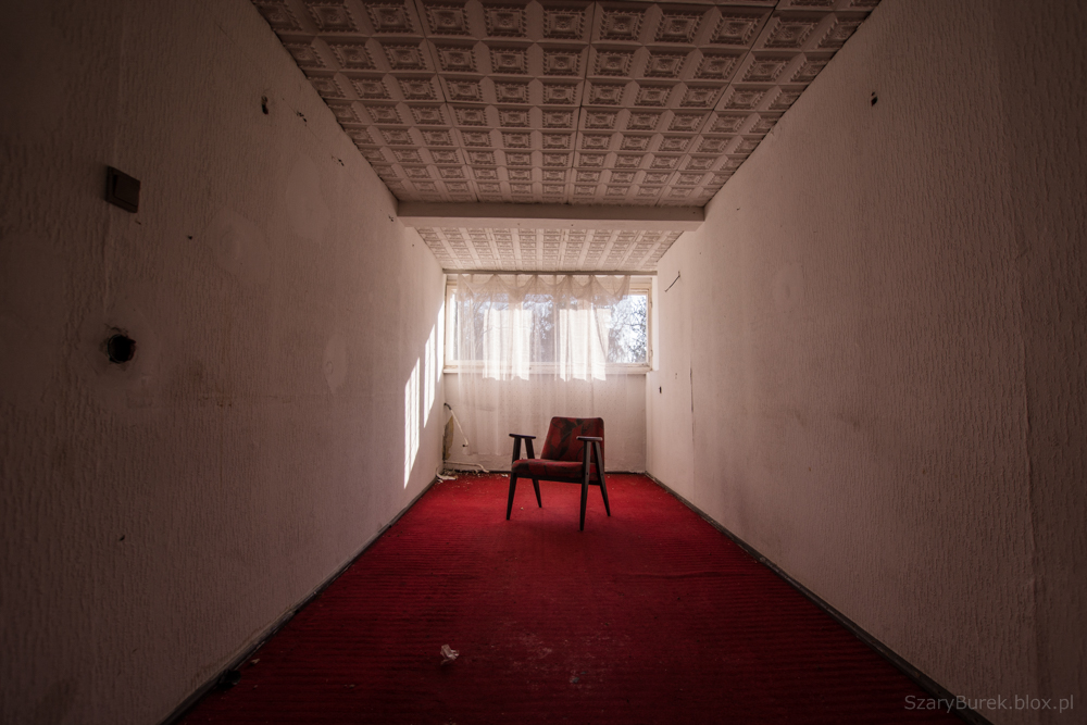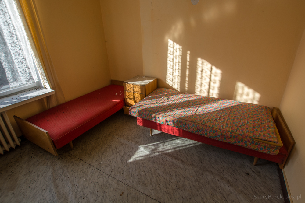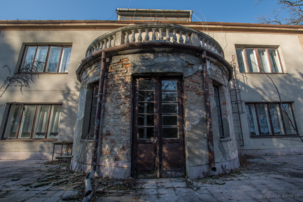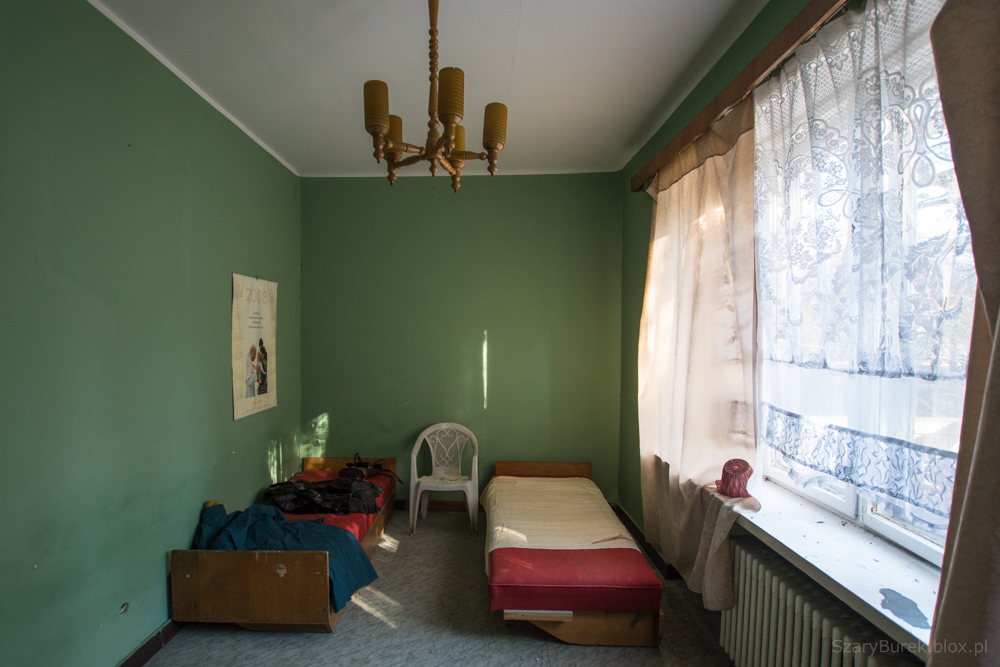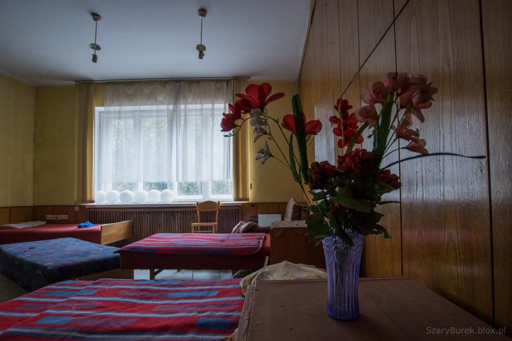 Ośrodek znajduje się w małej miejscowości obok Warszawy. Nie wiem nic na jego temat poza tym, że był to obiekt przeznaczony do celów szkoleniowo wypoczynkowych. Celowo nie podaję dokładnej lokalizacji, aby uchronić obiekt przed przypadkowymi osobami nie szanującymi takich miejsc. Bardzo dużo w tym budynku zachowało się wartościowych przedmiotów, w pokojach stoją jeszcze łóżka, które ktoś ładnie pościelił przed opuszczeniem budynku. Na piętrze znajduje się duża sala konferencyjna z przesuwaną na ścianie tablicą, w pokojach stoją krzesła, fotele, szafki i dwa telewizory (Obstawiam, że jeszcze działają). Na ścianach wiszą także kalendarze na których czas się zatrzymał na roku 2009. Piękny i klimatyczny obiekt, szkoda że popada w coraz większą ruinę…