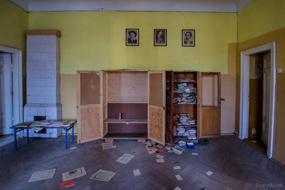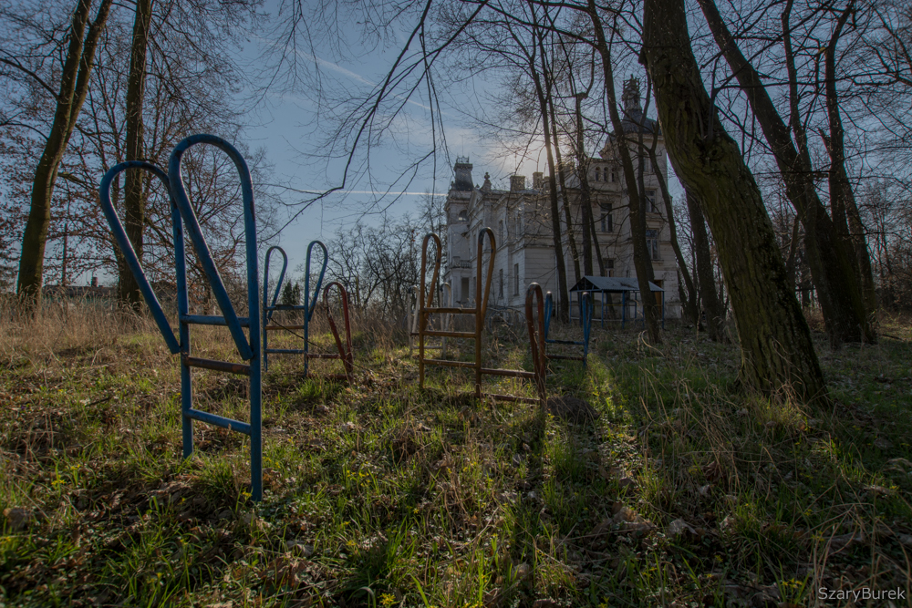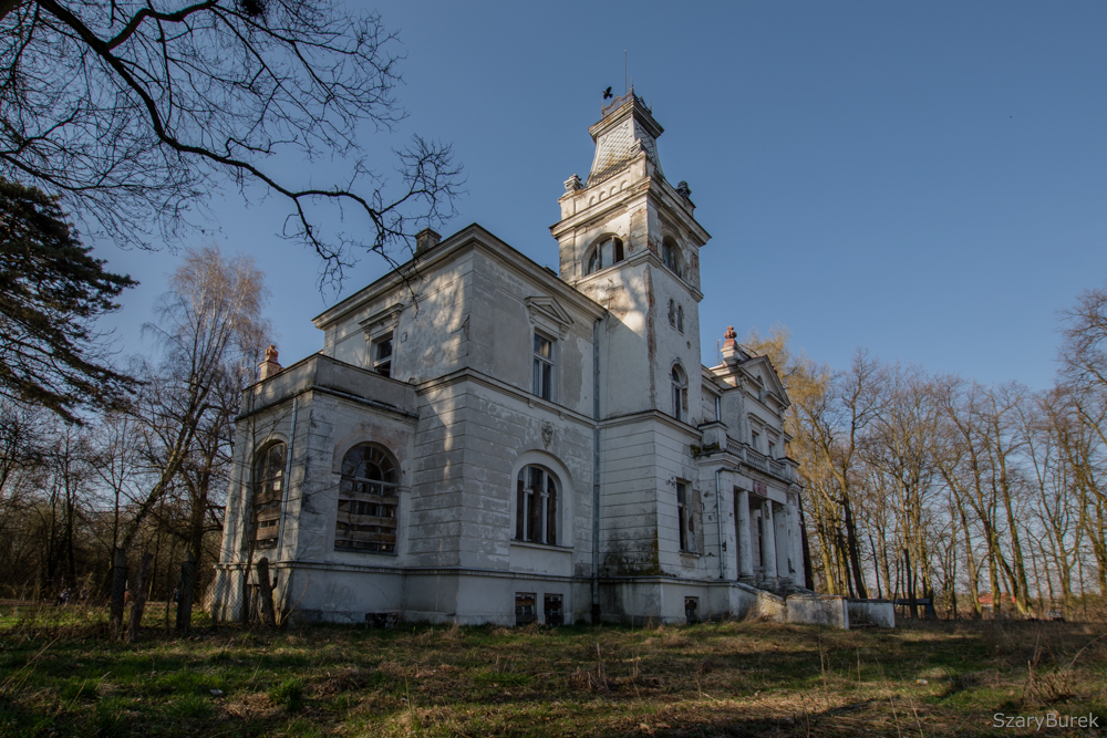 Ten piękny pałac został wybudowany w okolicach Warszawy w 1900 roku, w stylu włoskiego neorenesansu. Podczas II wojny światowej był tu szpital polowy. Następnie była tutaj szkoła podstawowa, chociaż od dawna jej tu już nie ma, tabliczka nadal wisi nad wejściem. Wewnątrz obiektu wiszą szkolne tablice, a na półkach leżą lektury i podręczniki. Przed pałacem znajduje się także plac zabaw, na którym już dawno przestały bawić się dzieci. Obecnie od dłuższego czasu nic się tam nie dzieje i obiekt popada w ruinę. Pałac wraz z otaczającym go parkiem wpisany jest do rejestru zabytków.