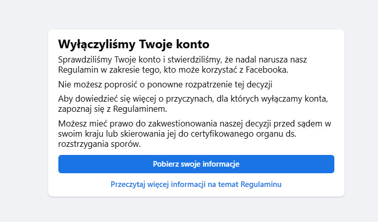 A tu w nocy dostałem maila, że moja strona na facebooku naruszyła zasady społeczności. W tej chwili moje prywatne konto na fejsie jest wyłączone, messenger nie działa, a Instagram nie istnieje. Widzę, że mój fanpage jeszcze żyje ale i tak tam nie mogę wejść nie mając facebooka. To wszystko należy do META, więc zablokowali mi dosłownie wszystko, nawet tego Threads.
